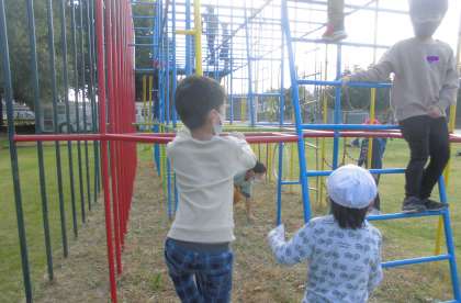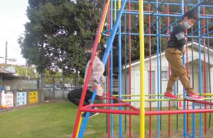 初めは,芝生でおにごっこをしていましたが,あとから来た友だちを誘って総合遊具へ行きました。