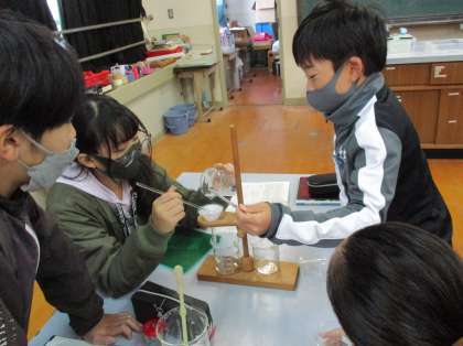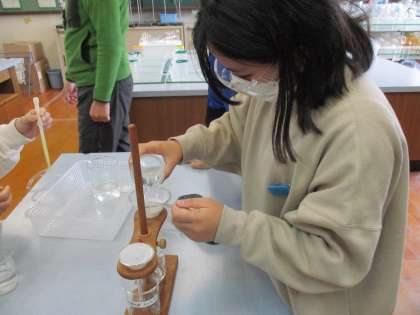 食塩とミョウバンを溶かした水溶液をろ過する実験をしました。ろ紙は破れやすいため扱いにくいですが,慎重に取り組むことができました。