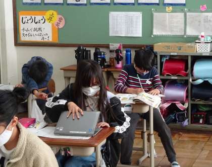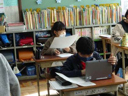 総合では,今まで学習してきたことを他学年にも広げるため,発表の準備をしています。「環境問題」,「自然災害」,「福祉」のテーマの中から1つを選んでまとめています。