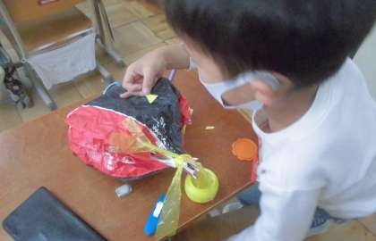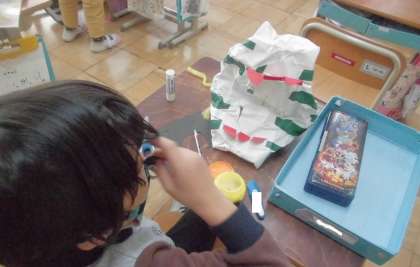 2年生は,図工の交流で「くしゃくしゃぎゅ」に取り組みました。「さめのように,ギザギザのきばをつくろうかな。」「ふくろうのくちばしはどんなかな。」と考えながら,作っていました。