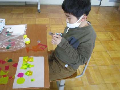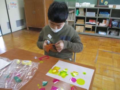 4年生の図工では「光のさしこむ絵」という作品に取り組んでします。カラーセロハンを家や太陽,模様の形に切って貼り付けていきます。光に透かしてみるととてもすてきな感じです。仕上がりが楽しみです。