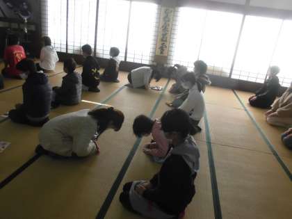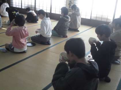 静かな雰囲気の中,茶道体験が行われました。いつも給食を食べるいろりの間ですが,緊張感に包まれていました。