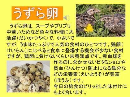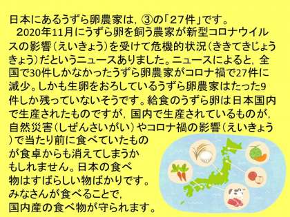 うずら卵を生産する農家さんがどんどん減っているというニュースが配信されました。今日の給食ニュースが,国産の食べ物を守っていくために,自分たちができることを考えるきっかけになればいいなと思います。