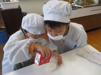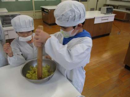 ゆであがったさつまいもをすりこぎでつぶしました。砂糖・牛乳・油を計量カップや大さじで正確にはかって,さつまいもと混ぜてくれました。アルミカップにもりつけて,トースターで焦げ目が少しつくまで焼きました。