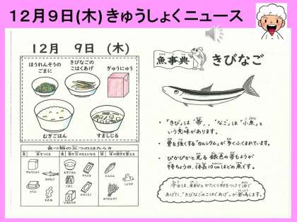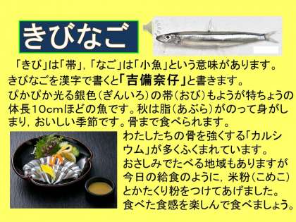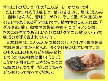 だしについて紹介されました。家庭科でも学習しますね。基本のだしの取り方を知っていると,いろいろな料理に活躍しそうです。今日のすまし汁は,だしの味がしっかりしていて,とてもおいしかったです。