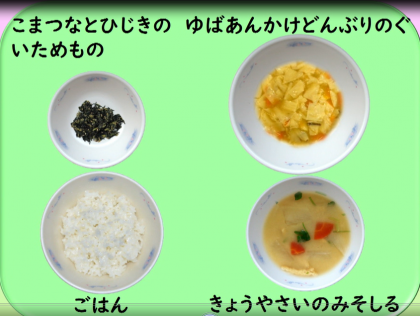 今日はなごみ献立で,ゆばあんかけどんぶりの具,小松菜とひじきのいためもの,京野菜のみそ汁,ごはん でした。