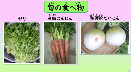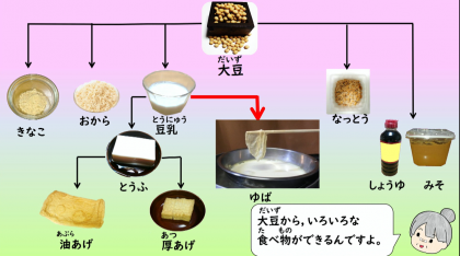 なごみムービーでは,湯葉や京野菜,旬の食べ物について紹介されました。大豆からいろいろな食べ物が作られていることも知れました。