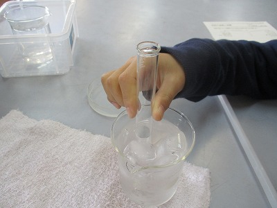 理科の学習で空気の体積について学習している4年生。今日は試験管にせっけん水をつけて膜を作り,お湯と冷水につけて空気の体積の変化を調べました。子どもたちは,手順を守り正確に実験することができました。