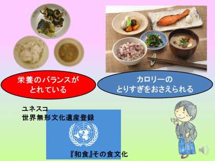 今日は,一汁二菜,一汁三菜について紹介されました。和食は,ユネスコの世界無形文化遺産に登録されています。文化を継承していくことも大切なのですね。今日は,なごみ献立ではありませんでしたが,和食について考え,味わうことができました。