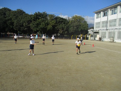 体育の学習でタグラグビーをしている4年生。今日はボールを使い,パス練習をしました。パスをする時の決まり事を大切に声をかけ合いながらしました。最初は不慣れなところもありましたが,回数を重ねるにつれて少しずつうまくパスを回すことができました。