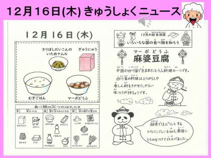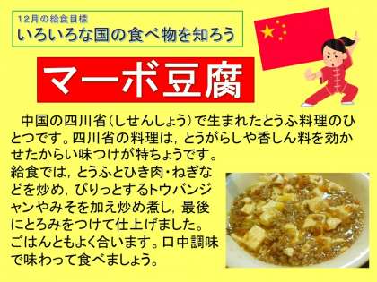 今日は,中国料理の代表マーボー豆腐でした。子どもたちも大好きなメニューです。給食室から具材を炒める香りがしてきて,子どもたちも食べるのを楽しみにしていました。