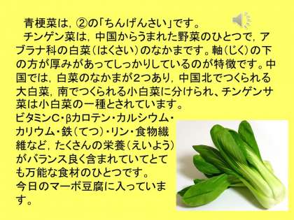 食品紹介は,青梗菜について・・・クイズは,青梗菜のの読み方についてでした。漢字では,あまり目にしませんね。チンゲン菜は栄養バランスのよい野菜だと紹介されていました。