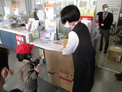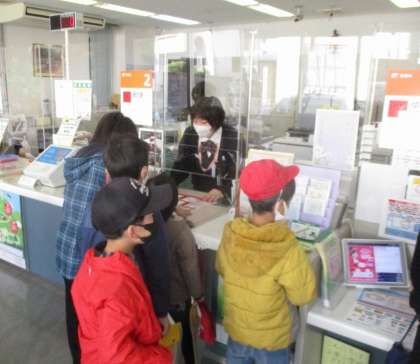京都上里郵便局へ見学に行きました。今日で2回目の訪問です。郵便局の学習を進めてきた中で疑問に思ったことを今日は質問しました。また,お客さんへの応対の仕方も見学しました。