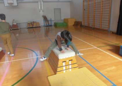 今日の体育館での活動は,とびばこあそびをしました。横跳びこしとびが得意な友だちがしているのを見て,「ぼくもやってみたい。」とおもいきってやってみると,上手に跳びこすことができました。