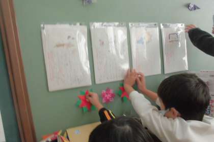 保健室の先生からお礼のお手紙が3くみに届きました。さっそく開けてみると,手紙とかざりが入っていました。手紙は,みんなに大きな声で読んでくれました。その後,ポインセチアの花と花のかざりを「かざりたい。」と言ってくれたので,みんなで教室の後ろに飾りました。