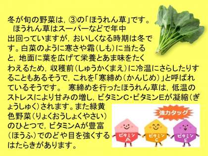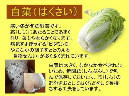 食品紹介は,白菜について・・・保存の仕方を工夫することで長もちさせることもわかりました。冬の旬の野菜をいただき,寒い冬を乗り越えていってほしいと思います。