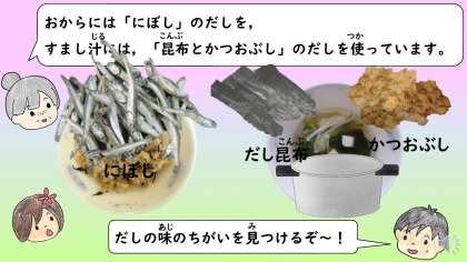 また,今日は2種類のだしがつかわれました。おからとすまし汁,それぞれに違うだしがつかわれていましたね。味のちがいを楽しんで給食を食べたのではないかと思います。