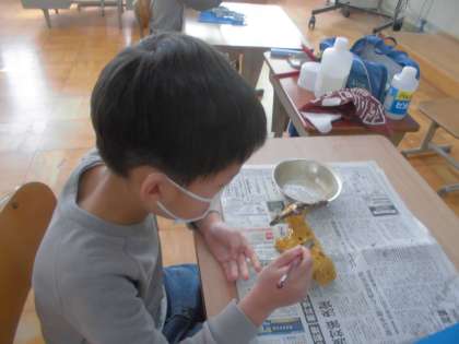 また,色付けの終わった人は,ニスをていねいに塗りました。ひかって色が鮮やかに見えました。