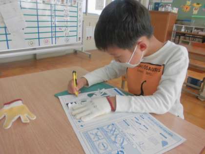 2年生は図工の学習で,カッターナイフの使い方を学習しました。初めに画像を使って,カッターナイフの出し方やしまい方,押さえる手の位置などを確認しました。