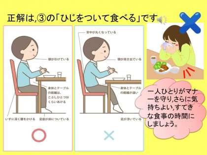 マナーを守って食べることができる児童はたくさんいますが,姿勢はどうでしょうか?ついつい肘をついてしまう。いつの間にか背中を丸めて食べている。などの姿勢になっていませんか?一度自分の食べる姿勢を見直してみるきっかけになればいいなと思いました。