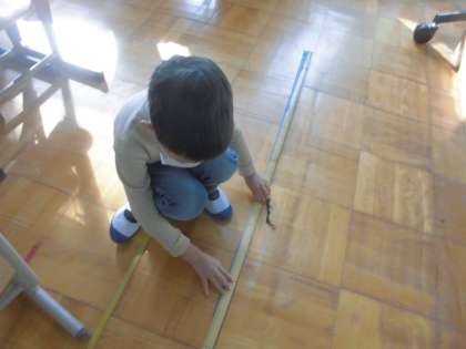 1mだと思う長さのところで,紙テープを切って,実際にものさしで測ってみました。1mは,自分が手を広げたより少し短かったということを覚えていたので,手を広げて「これくらいかな?}と考えて切っていました。