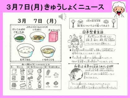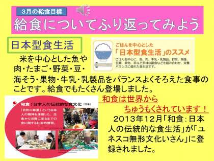 世界から注目されている和食。給食でもたくさんの和食が登場しました。今日の給食ニュースでは,主食・主菜・副菜をうまく組合せ,栄養のバランスがとれた食生活を心がけていくことが大切であると紹介されました。