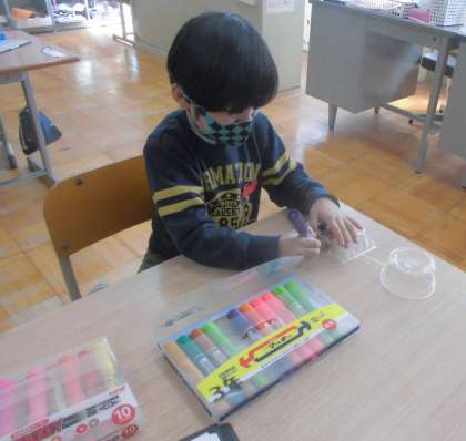 できた車にマジックで色を塗ったり,動かして見て動きを楽しんだりしていました。
