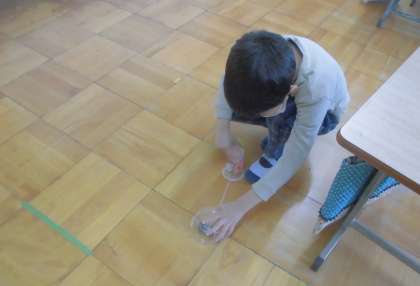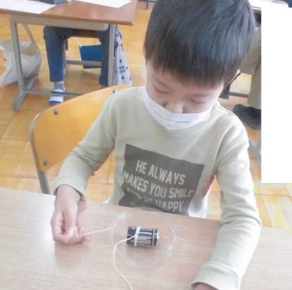 先日から作り始めたコトコトと動く車。小さな穴にゴムを通すのは,とても大変です。根気よく穴にゴムに通した糸を通したり,千枚通しで穴をあけるのに挑戦したりと自分たちだけで作ろうとがんばっていました。