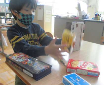 2年生は,算数ではこの形を学習しています。箱の面の数を数を書きながら調べました。