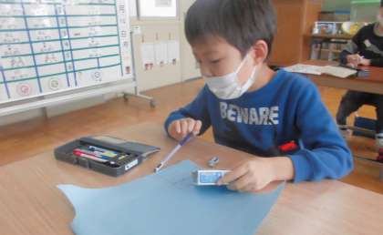 また,面の形を写し取って,箱の面に貼りました。全部写し取ったと思っていたけど,たりないところがあることに気づき,「あと2ついる。」など6面あることを意識しているようでした。