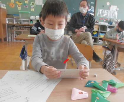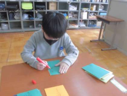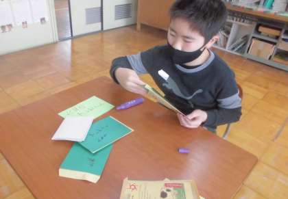 3組で育てた綿から取った種をプレゼントしようと封筒などに入れて配る準備をしました。育て方のお手紙も入れました。大切に育ててくれたらうれしいですね。