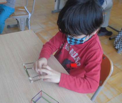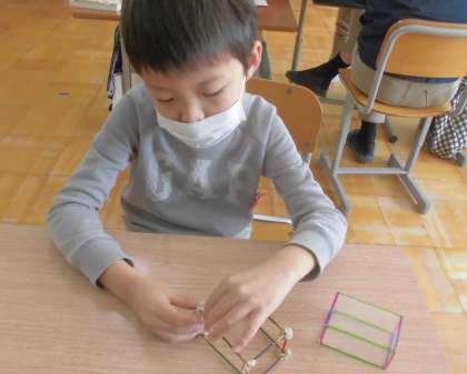 2年生は算数の学習で,竹ひごとねん土玉をつかってはこの形を作りました。それぞれの辺や頂点の数を確認して,「6センチを4本」「ねんど玉を8こ」など必要な数を伝えてもらってから作りました。できあがると,うれしそうでした。