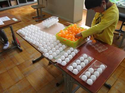 1年生児童が卵パックを使って10のまとまりをたくさん作りました。