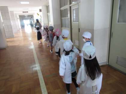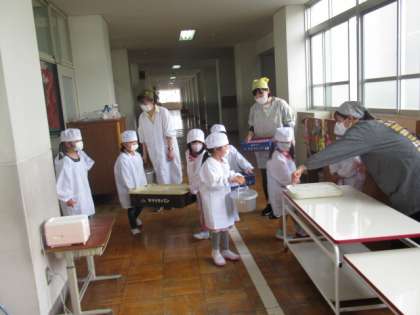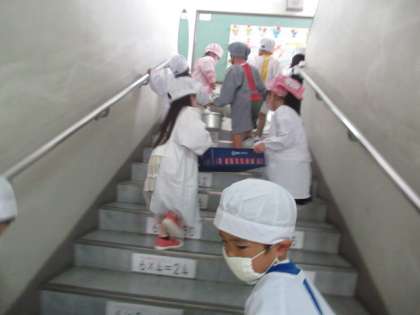 1年生は小学校で初めての給食。用意も自分たちでします。給食室へ食器や食缶を取りに行きました。重いもの,給食当番みんなで協力して運びました。みんなのためにがんばって運びます!