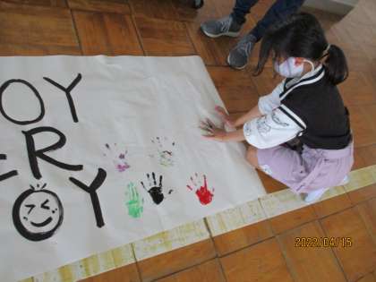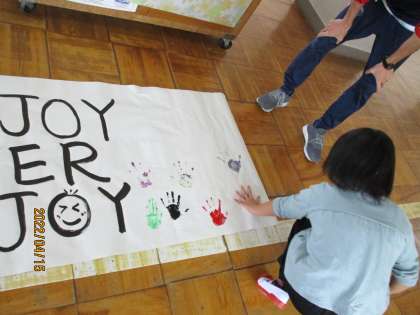 今日,図工で作った自分だけのオリジナルの色を手にぬり,学年目標にスタンプしました。