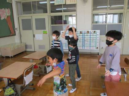 英語の時間,音楽に合わせて手遊び歌をしました。