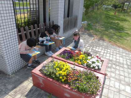 図工の「おはなみスケッチ」の学習で,学校の中の春だなと感じるものを探しに行きました。