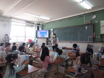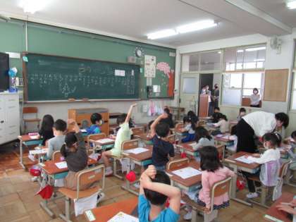 小学校でのはじめての授業参観。緊張の中にもおうちの方を見つけて嬉しそうに頑張る子どもたちの姿が素敵でした。今日は「つ」のひらがなを練習しました。「つ」のつく言葉をたくさんみんなで考えました。
