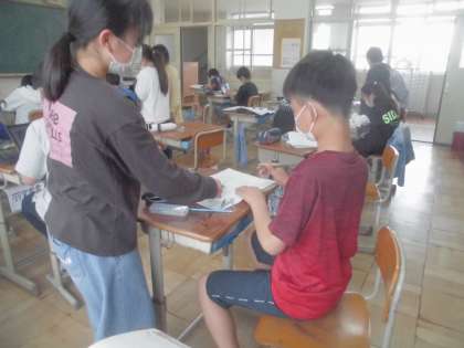 線対称の作図をしました。コンパスや三角定規を使って書きました。線対称の性質である,対称の軸と垂直になることと長さが等しくなることを使って書いていました。また,教え合う姿もみられました。みんなで学んでいる姿が素敵でした。