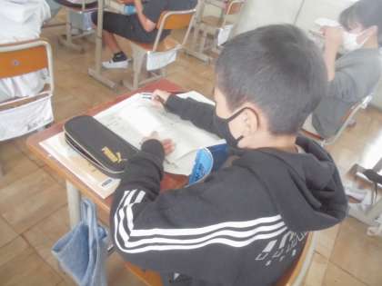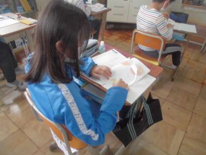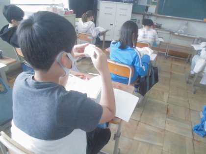 線対称の学習が終わり,点対称の学習になりました。点対称の対応する点や線,角を見つけました。ノートをひっくり返したり,頭の中で考えたりしていました。