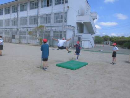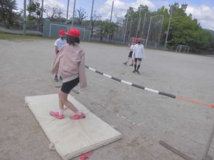 3歩助走で高跳びをしました。アドバイスを言い合う子どももいて素敵でした。