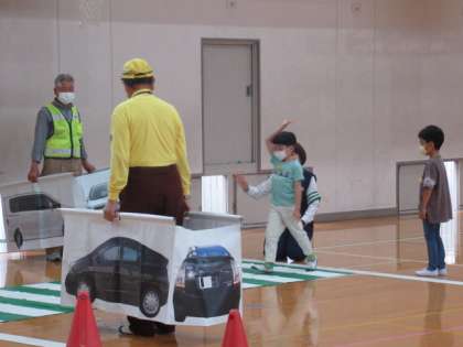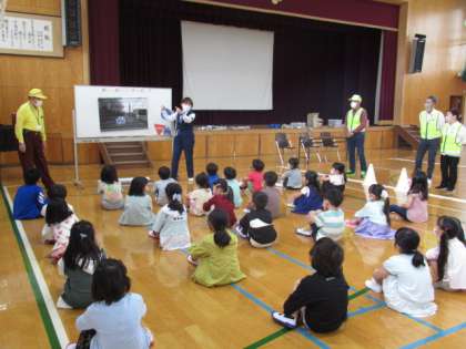 地域の方や西京警察の方にお世話になって交通安全教室がありました。横断歩道の渡り方や見通しの悪い曲がり角での歩き方など,事故にあわないための安全についてたくさん学習できました。