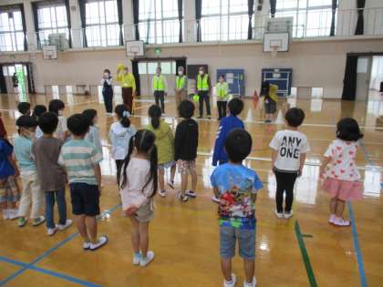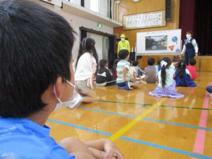 1年生児童は,交流学級の子たちと混じって交通安全教室へ参加しました。