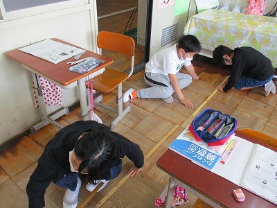 次に教室の長さを測り,教室の容積を調べました。「教室はこんなに大きいんだ。」と実感したようでした。
