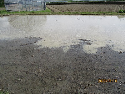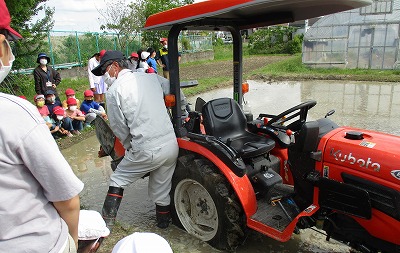 初めに地域の方から代かきをなぜするのかやトラクターについて説明していただきました。代かきをしたところと,していないところが,水の色や土の様子が違うためくっきりと分かりました。
