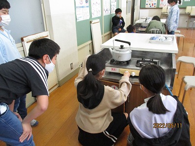 ガスコンロの安全な使い方を学習しました。一人ずつコンロで火をつける練習をした後,やかんでお湯を沸かしてお茶を入れました。