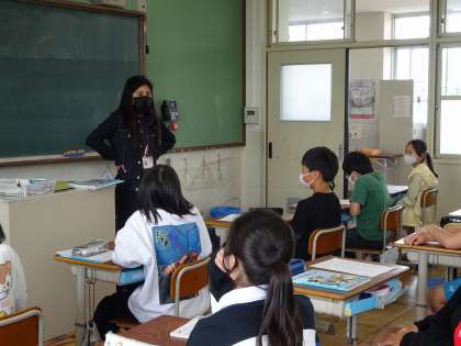 外国語の学習では,自分の出身地や得意なことを英語で交流しました。ALTのサイラ先生や友達とできるだけ長く会話が続けられるよう,質問したり,レスポンスしたり今まで学習したことを活かしていました。