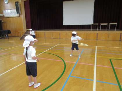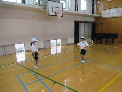 腰でまわしたり,なわとびのようにして跳んだりしました。