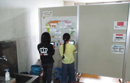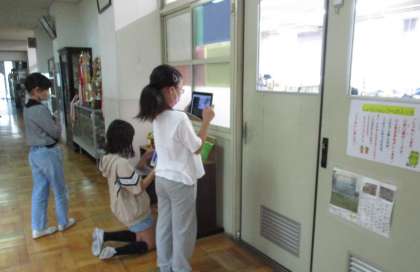 図工の学習で自分の人形を画用紙で作りました。人形を校内のいろいろな所に置いてみると・・・いつもとちがうところに見えてきたようです。
