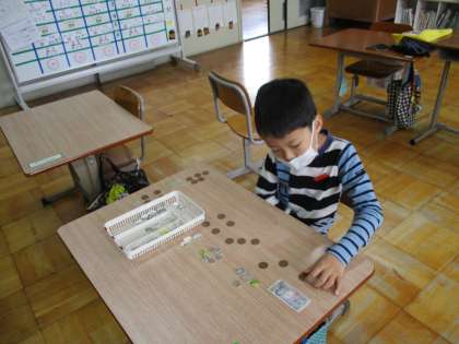 子どもたちは数字よりも具体物のお金の方が意欲的に学習を進めています。